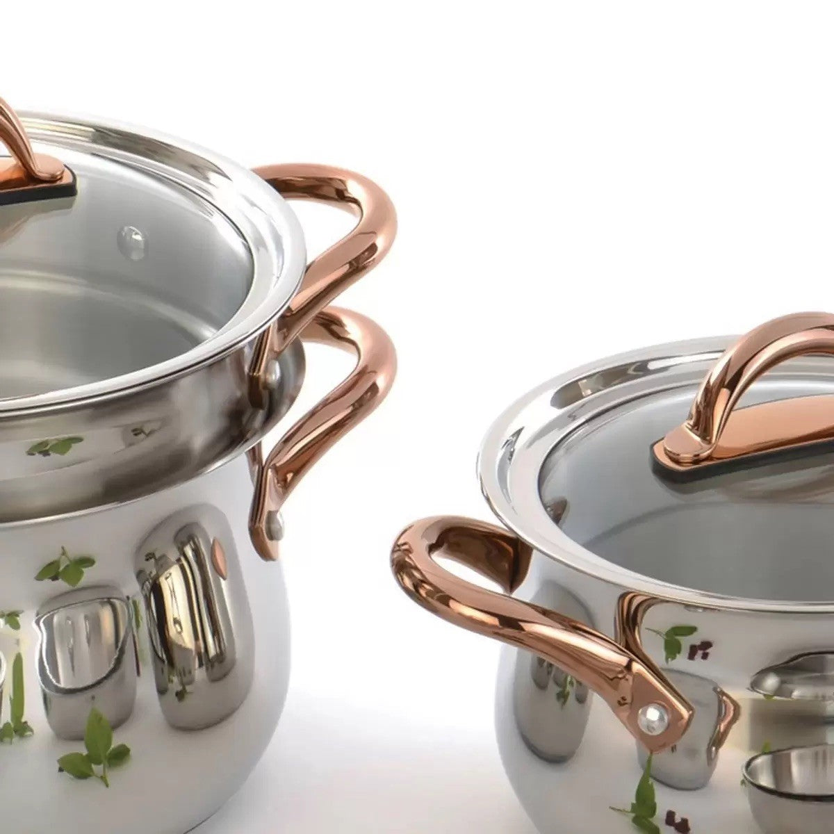 BergHOFF Ouro 11pc Stainless Steel Cookware Set with Rose Gold Handles & Glass Lids is designed for exceptional functionality and bold beauty. Featuring high-polish copper coated stainless steel accents and rose gold handles with ergonomic handles, this line was designed for optimal durability and cooking versatility. Constructed from durable 18/10 stainless steel, BergHOFF's cookware is built to withstand a lifetime of heavy use with a fast, simple cleanup. Ouro also comes induction-ready and guarantees the finest culinary experience.