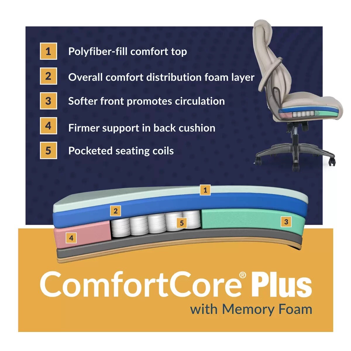 - TrueWellness® AIR Ergonomic Support Technology® pivots for continuous lumbar support